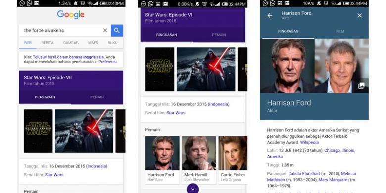 Misalnya ketika mencari kata kunci "The Force Awakens" -sekuel terbaru Star Wars- pada kolom pencarian. Pengguna akan diberi tahu tanggal perilisan, sekuel apa saja yang sudah pernah dirilis, serta foto-foto dan biodata pemain.